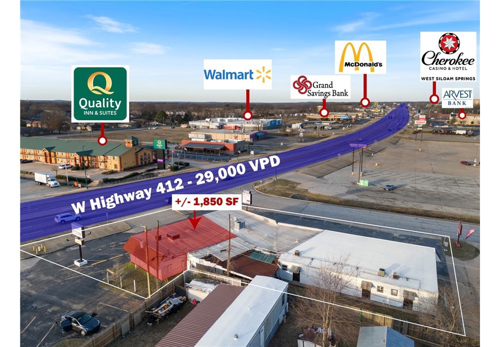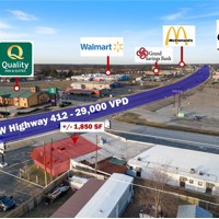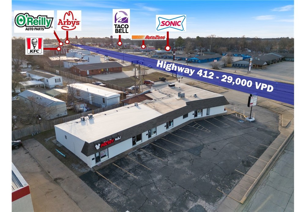 +/- 1,850 SF retail/office space fronting US-412 in Siloam Springs, offering prime visibility and accessibility. This suite is currently being utilized as a retail store featuring a reception/welcoming area, 7 private offices, patient rooms, or separate retail floors, private restroom, and storage closet. Positioned at the intersection of US-412 (29,000 VPD) and Dogwood St (1,700 VPD), this location ensures excellent exposure. Additionally, it is less than a half mile from Walmart Neighborhood Market, and surrounded by major national retailers such as Harbor Freight, Dunham's Sports, KFC, Sonic Drive-In, O'Reilly Auto Parts, and more. This is a fantastic opportunity to establish your business. Offered on a modified gross lease, tenants are responsible for their own electric and gas, plus $150/mo for water and trash.