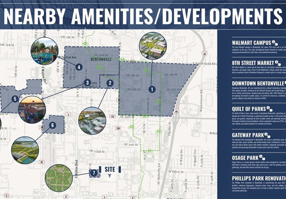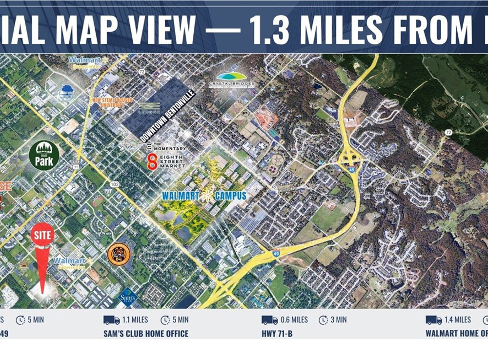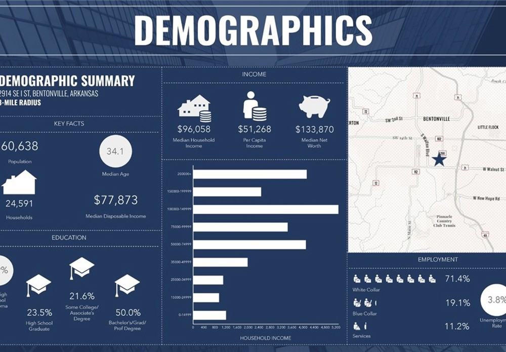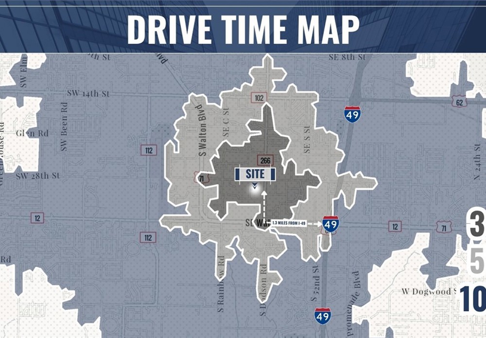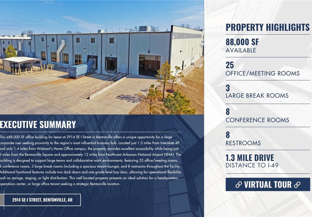 This ±88,000 SF office building for lease at 2914 SE I Street in Bentonville offers a unique opportunity for a large corporate user seeking proximity to the region’s most influential business hub. Located just 1.3 miles from Interstate 49 and only 1.4 miles from Walmart’s Home Office campus, the property provides excellent accessibility while being just 3 miles from the Bentonville Square and approximately 12 miles from NWA National Airport (XNA). The building is designed to support large teams and collaborative work environments, featuring 25 office/meeting rooms, 8 conference rooms, 3 large break rooms (including a spacious tenant lounge), and 8 restrooms throughout the facility. Additional functional features include two dock doors and one grade-level bay door, allowing for operational flexibility such as storage, staging, or light distribution.