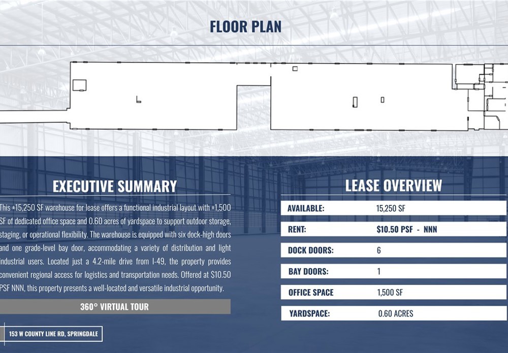 This ±15,250 SF warehouse for lease offers a functional industrial layout with ±1,500 SF of dedicated office space and 0.60 acres of yard space to support outdoor storage, staging, or operational flexibility. The warehouse is equipped with six dock-high doors and one grade-level bay door, accommodating a variety of distribution and light industrial users. Located just a 4.2-mile drive from I-49, the property provides convenient regional access for logistics and transportation needs. Offered at $10.50 PSF NNN, this property presents a well-located and versatile industrial opportunity. Lease overview Available: 15,250 SF. Rent: $10.50 PSF NNN. Dock doors: 6. Bay doors: 1. Office space: 1,500 SF.