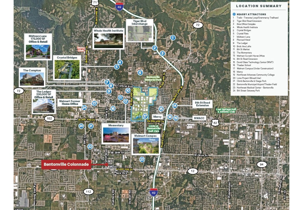Discover a highly visible retail opportunity at Bentonville Colonnade, offering prime space in a bustling area. With available suites of ±2,684 SF (Suite 20, an end-cap restaurant opportunity) and ±1,117 SF (Suite 30), this location boasts excellent visibility with over 21,000 VPD on S Walton Blvd. Benefit from proximity to major corporate headquarters, shopping, dining, and the Bentonville Municipal Airport. Lease rate is $24/SF (NNN).