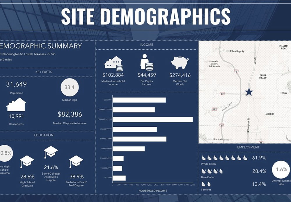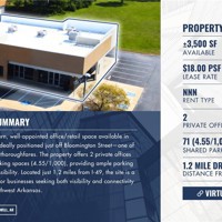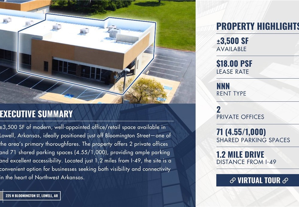 ±3,500 SF of modern, well-appointed office/retail space available in Lowell, Arkansas, ideally positioned just off Bloomington Street—one of the area’s primary thoroughfares. The property offers 2 private offices and 71 shared parking spaces (4.55/1,000), providing ample parking and excellent accessibility. Located just 1.2 miles from I-49, the site is a convenient option for businesses seeking both visibility and connectivity in the heart of Northwest Arkansas.